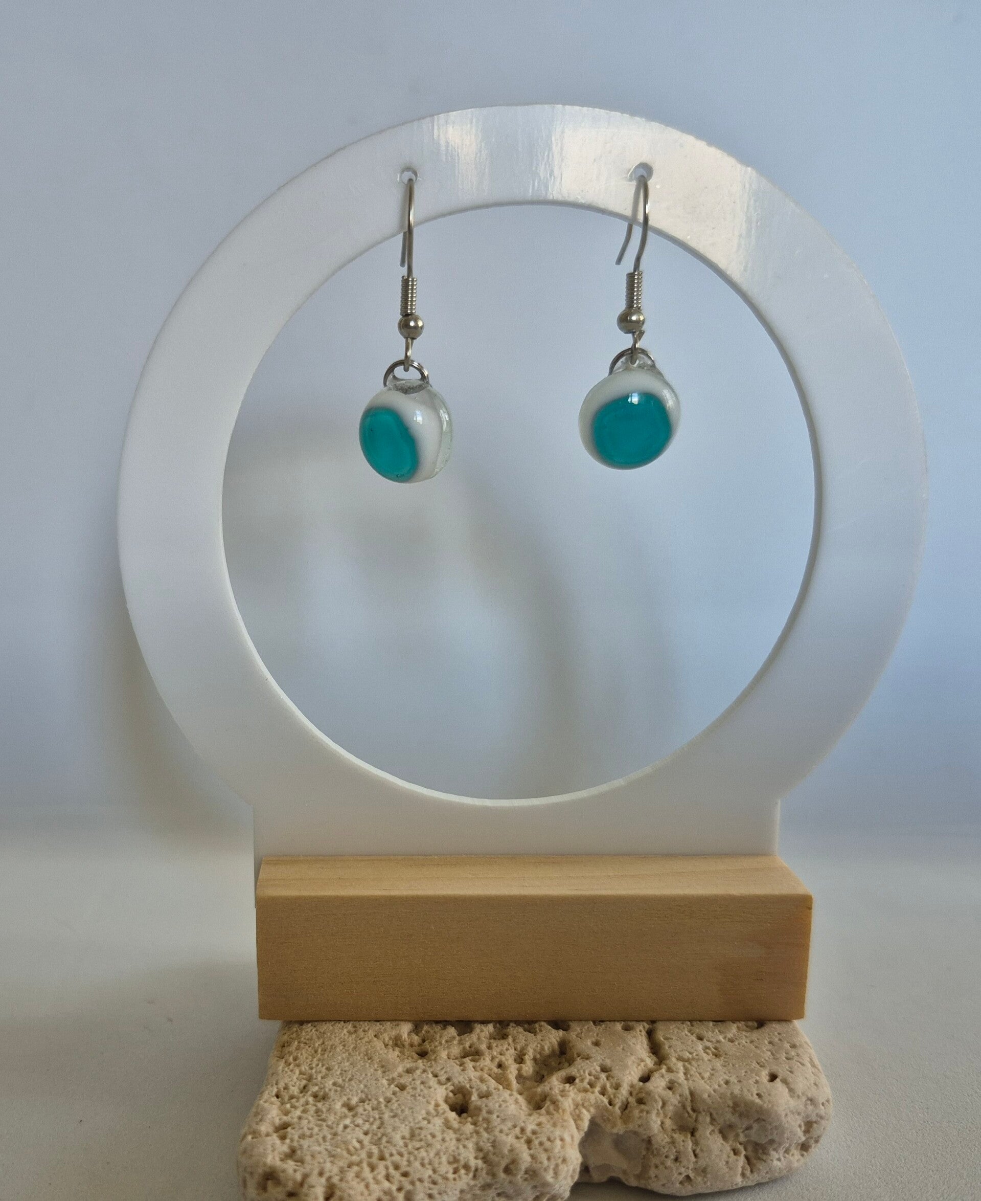 Boucle d'oreille pendante en verre fusing couleur blanc et bleu sur un alliage en acier inoxydable.