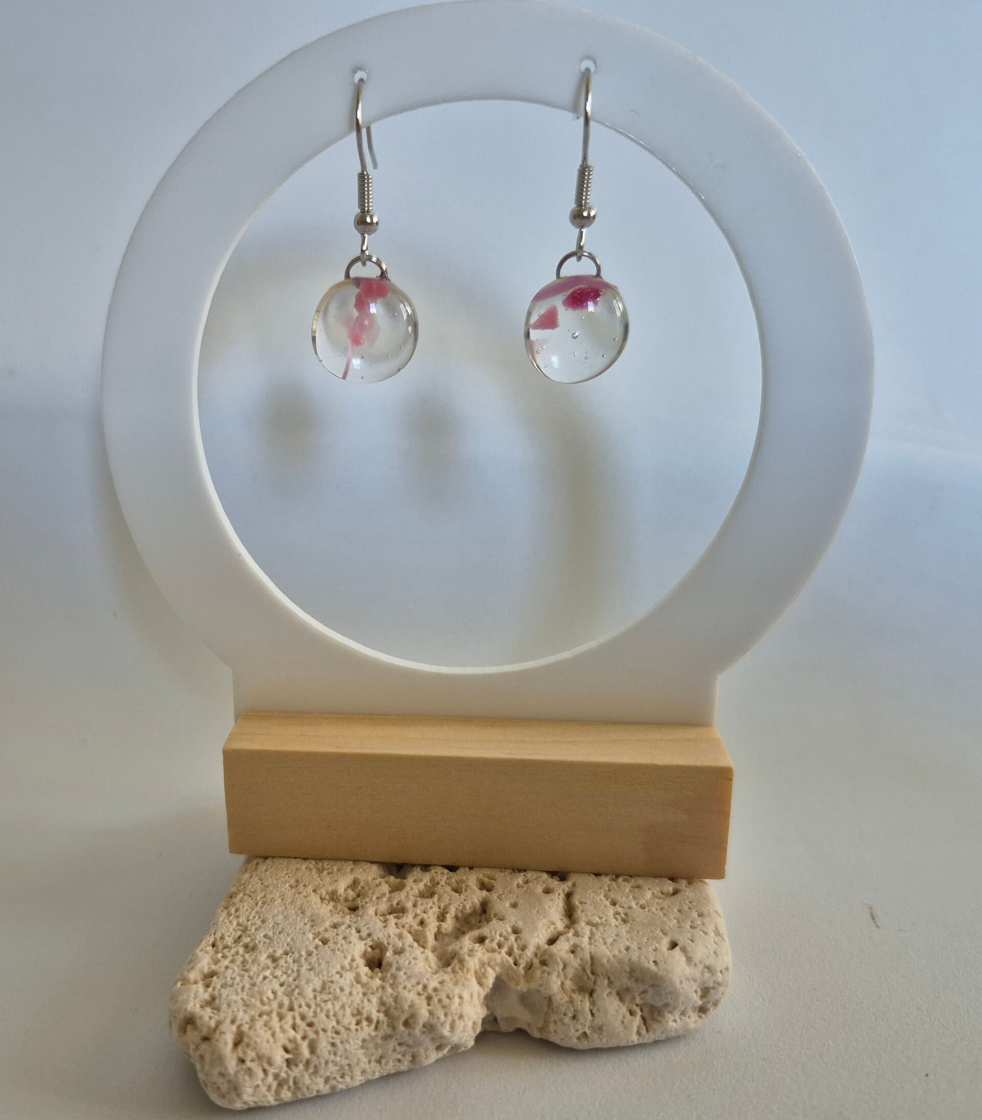 Boucle d'oreille pendante en verre fusing couleur blanc transparent et rose sur un alliage en acier inoxydable.