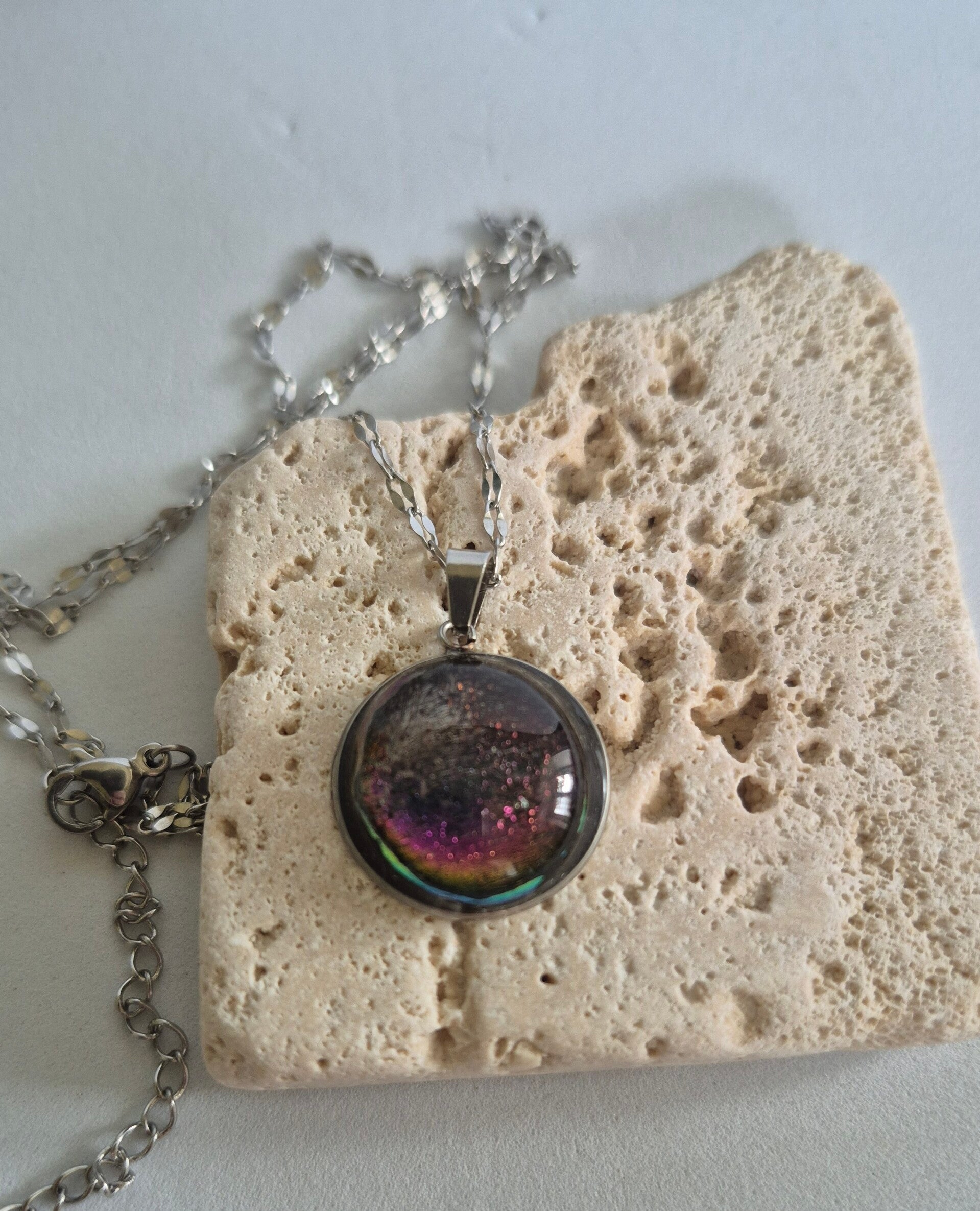 Pendentif en verre dichroique reflets de plusieurs couleurs avec un alliage en acier inoxydable 45cm.