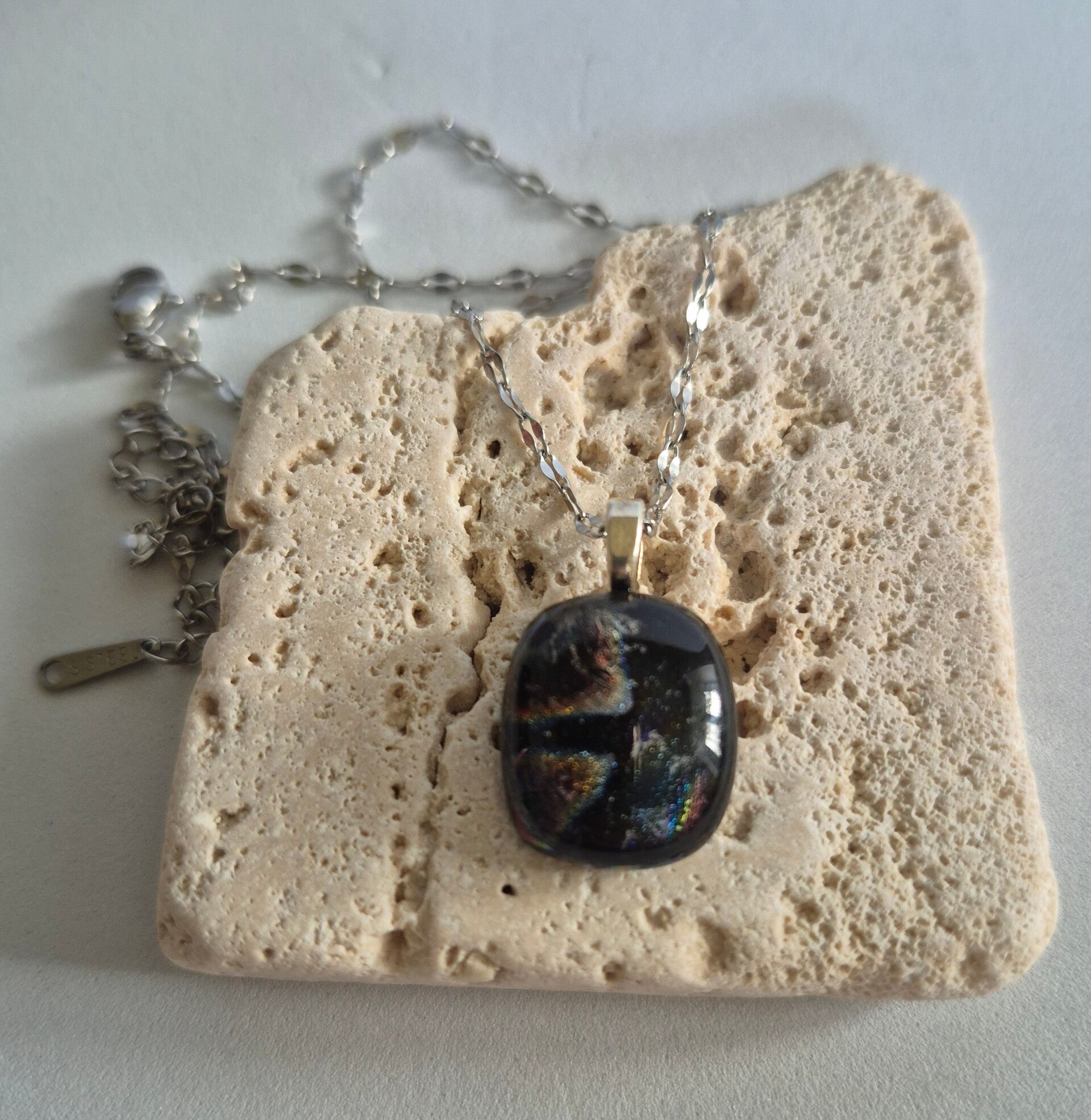 Pendentif en verre dichroique plusieurs reflets de couleurs avec une chaîne en acier inoxydable 45cm.