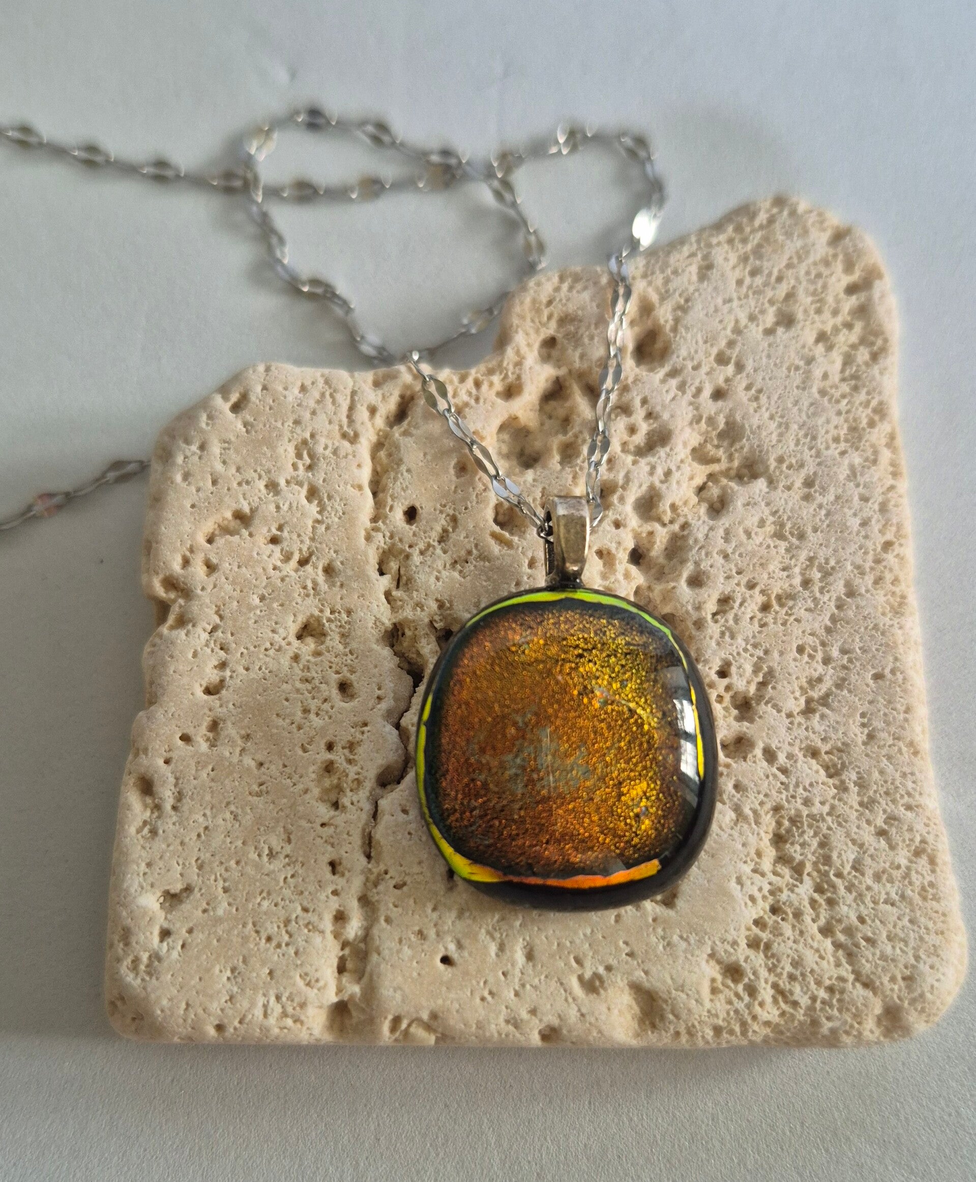 Pendentif en verre dichroique couleur doré irisé avec une chaîne en acier inoxydable 45cm.